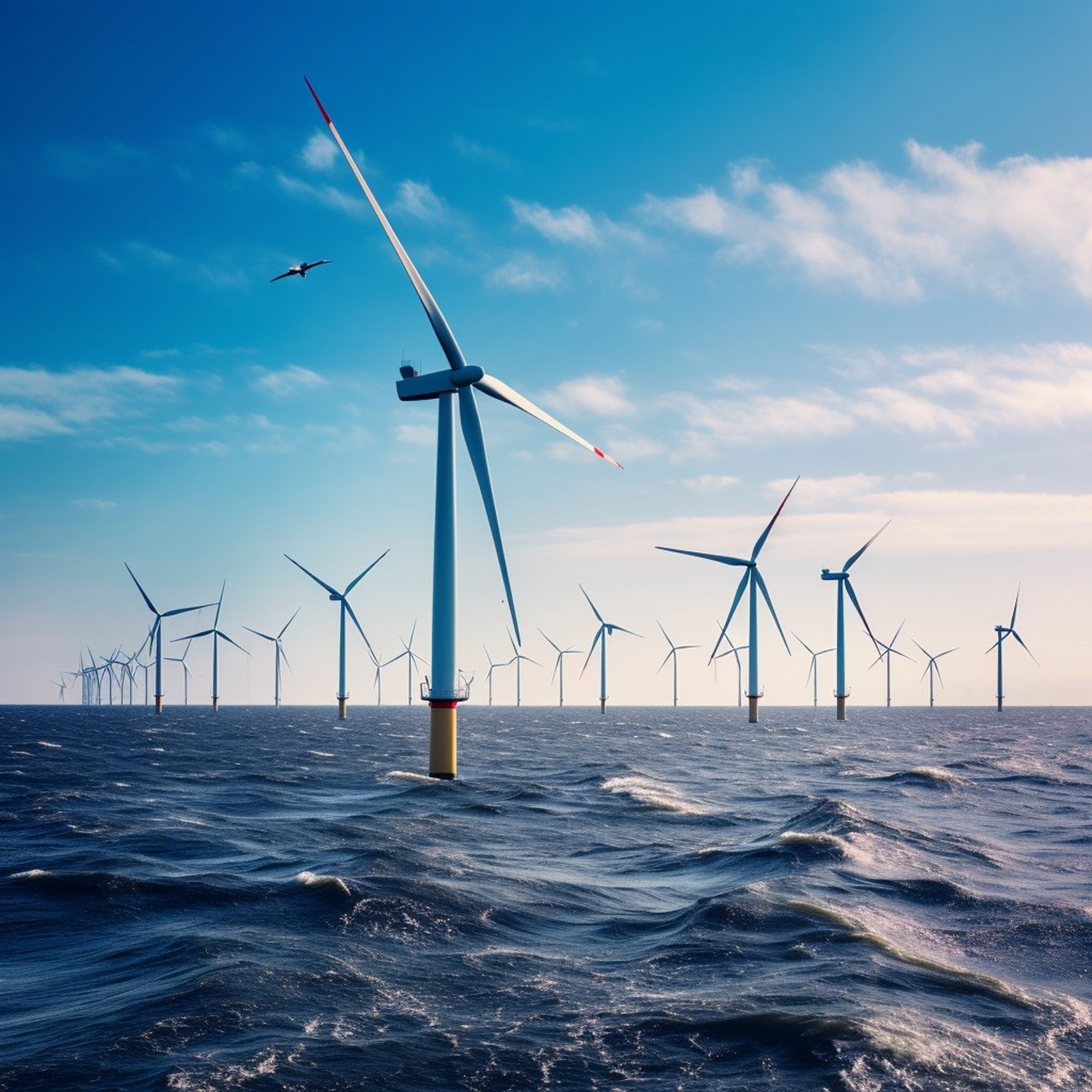 Imagen generada con inteligencia artificial que representa un ave marina volando entre generadores de energía eólica marina. - SEO/BIRDLIFE