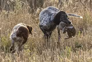 Archivo - Dos perros corren, uno de ellos con una presa ya en la boca, durante una jornada de caza el primer día de inicio de la media veda en Castilla y León, en Olmedo, a 15 de agosto de 2021, en Valladolid, Castilla y León (España). La media veda arr - Photogenic/Pablo Requejo - Europa Press - Archivo