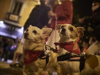2 perros con pañuelos sanfemrineros junto a varias personas se concentran en la Plaza del Ayuntamiento de Pamplona, donde tradicionalmente se entona el 'Pobre de mí' para despedirse de los sanfermines, a pesar de no haberse celebrado, a 13 de julio de 2 - EUROPA PRESS