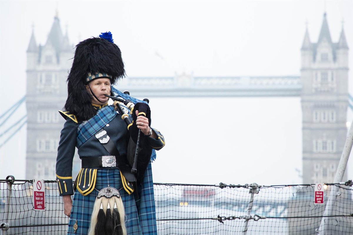 HANDOUT - 15 August 2020, England, London: Pipe Sergeant Neil Esslemont of RAF Halton Pipes & Drums plays in front of the Tower Bridge on the 75th anniversary of the Victory over Japan Day. Photo: Po Phot Dave Jenkins/Mod via PA Media/dpa - ATTENTION: e - Po Phot Dave Jenkins/Mod via PA / DPA - Archivo