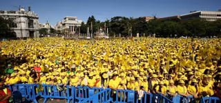 Los actos de celebración han comenzado a las 10.30 horas de este domingo. Los asistentes vistieron camisetas amarillas, el color de la organización, y bailaron al son de batucadas y charangas en su marcha por el Paseo de Recoletos, que une la Plaza de Cibeles con la Plaza de Colón en Madrid.