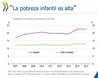 Para la OCDE, los niveles generales de pobreza y la pobreza infantil siguen siendo elevados en España. Además, ha señalado que los niveles de pobreza son especialmente altos en los hogares con desempleados, especialmente aquellos que tienen hijos, tal y como refleja la elevada tasa de pobreza infantil del 23,4%, en comparación con un promedio del 13,3% en 2013 en la OCDE.