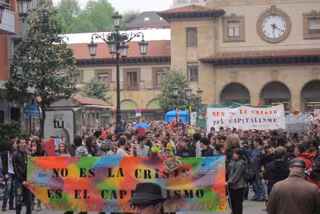 Una multitudinaria manifestación ha arrancado pasadas las 18.00 horas desde la estación de Renfe en Oviedo, encabezada por el movimiento 15-M, con una pancarta 'No es la crisis; es el capitalismo'.