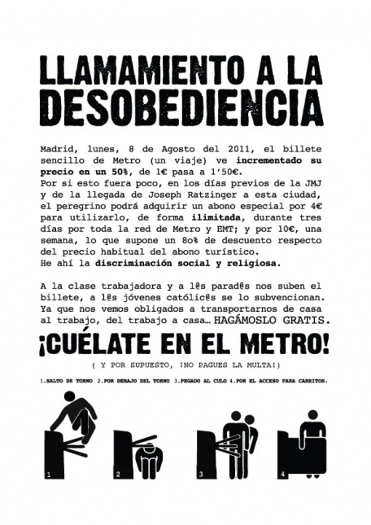 "He ahí la discriminación social y religiosa. A la clase trabajadora y a los parados nos suben el billete, a los jóvenes católicos se lo subvencionan. Ya que nos vemos obligados a transportarnos de casa al trabajo, del trabajo a casa, hagámoslo gratis. ¡Cuélate en el Metro y por supuesto no pagues la multa!", han agregado.