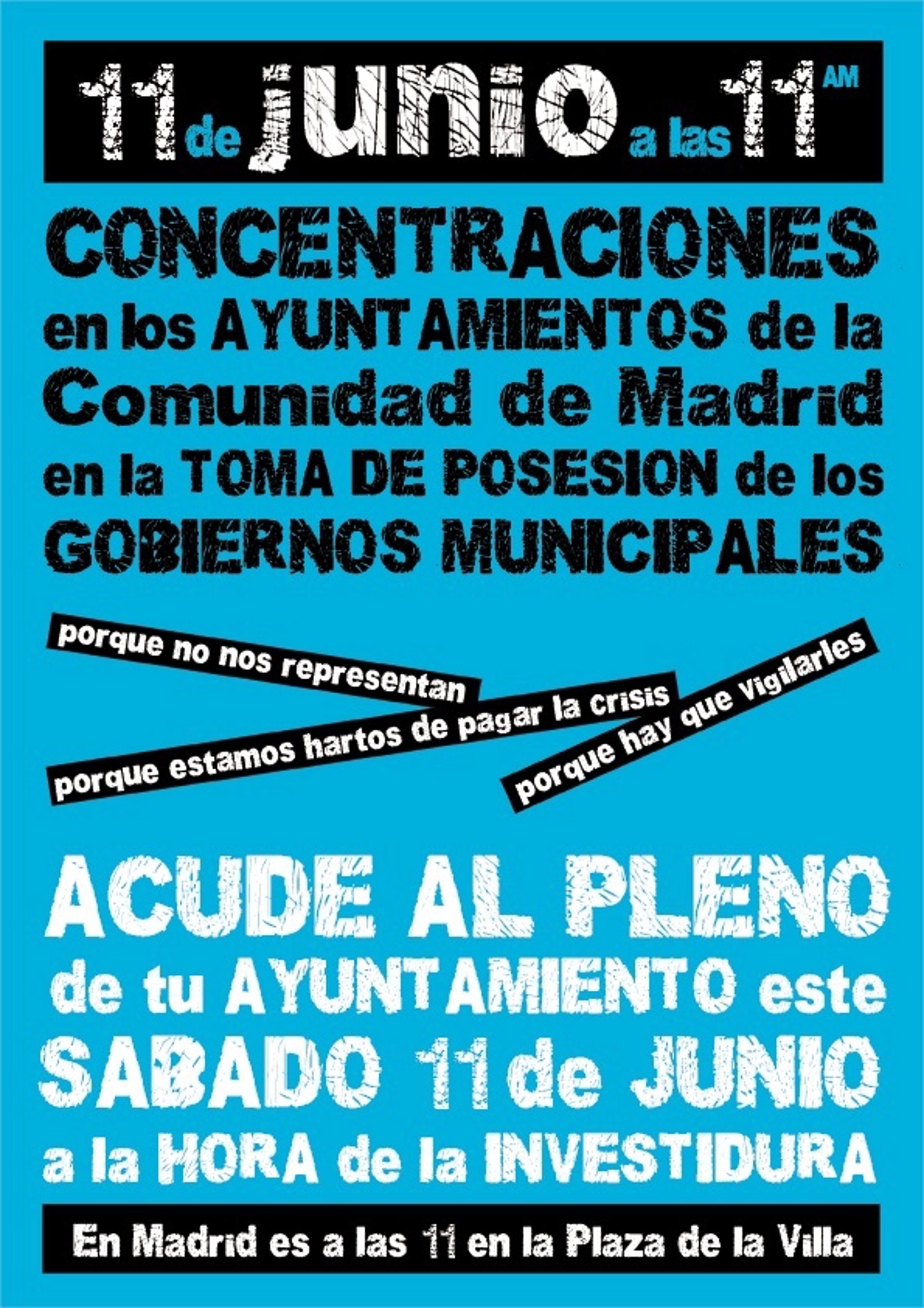 Así, la protesta con centro en Sol continuará con la acción descentralizada iniciada en la convocatoria de barrios y municipios de la región, con una acción conjunta ante las puertas de cada Consistorio, y trasladar así a los próximos responsables locales su malestar.