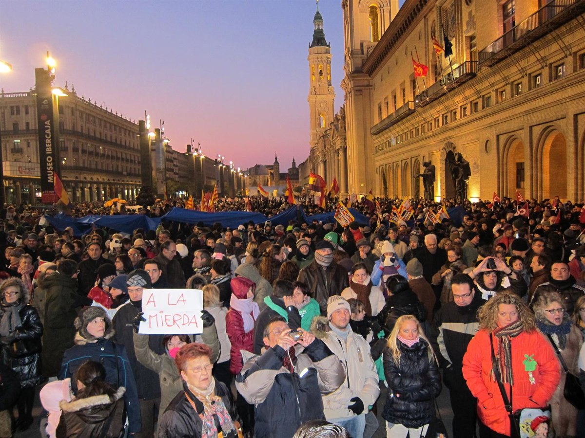 Numerosos ciudadanos han acudido al llamamiento de la Marea Ciudadana para concentrarse, en la Plaza del Pilar de Zaragoza, en contra de los recortes en los servicios básicos del Estado del bienestar y para exigir una "verdadera democracia"·