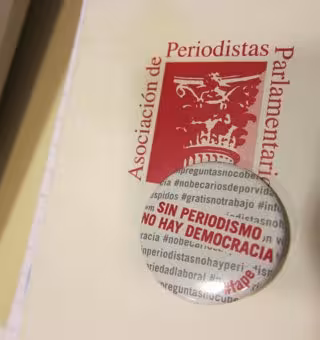 El presidente del Gobierno, Mariano Rajoy, ha recibido este jueves una de las chapas con el lema 'Sin periodismo no hay democracia' que lucían muchos informadores en la recepción por el aniversario de la Constitución que ha tenido lugar en el Senado para reivindicar la labor social de un gremio que, como tantos otros, está sufriendo los estragos de la crisis económica.