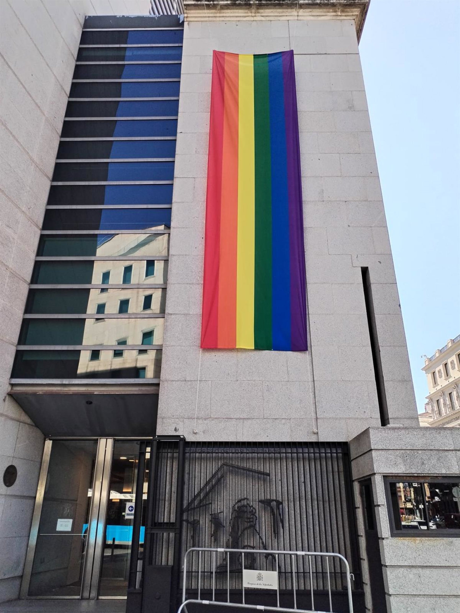 La puerta de entrada al Congreso de los Diputados por la calle Cedaceros de Madrid exhibe una bandera arcoíris con motivo de la celebración del Orgullo LGTBI. - EUROPA PRESS