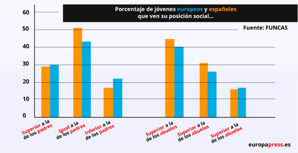 Con respecto a Europa, Funcas señala que en España la percepción de ascenso social en el marco de la propia familia "se halla más extendida que en el conjunto de la Unión Europea". Así, los españoles que dicen haber ascendido en la escala social respecto a los abuelos son más que los europeos, que se sitúan en torno a un 40 por ciento.