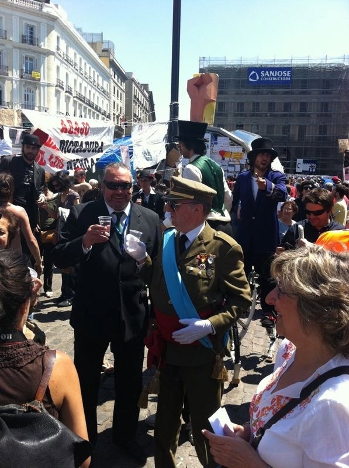 Los acampados en la Puerta del Sol de la capital han recibido este sábado la visita de un doble del Rey, acompañado de guardaespaldas y escoltado por banqueros zancudos.