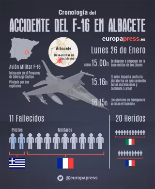 La catástrofe aérea ocurrida este lunes 26 de enero en Los Llanos (Albacete) es una de las peores en la historia de la aviación militar en España. Su saldo es de 11 víctimas mortales: dos pilotos griegos y otros nueve militares franceses.