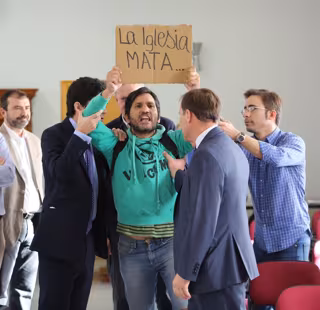 El obispo se encontraba respondiendo a las preguntas de los periodistas cuando el activista, que se encontraba al fondo de la sala, ha levantado un cartel en el que se leía 'la Iglesia mata' y se ha intentado acercar al obispo pidiendo que le dieran la palabra, mientas dos hombres le sujetaban. Osoro ha pedido que le dejaran hablar y Lagarder ha comenzado a lanzar críticas.