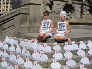 Medio centenar de activistas de la asociación Anima Naturalis se han manifestado semidesnudos y rodeados de 100 conejos de papel este domingo en la plaza Catalunya de Barcelona para denunciar al maltrato al que se ven sometidos los animales en el campo de la experimentación cosmética y reivindicar el uso de alternativas éticas.