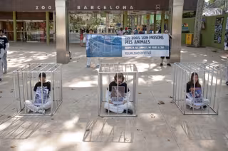 Tres activistas de Igualdad Animal (IA) se han enjaulado este miércoles a las puertas de Zoo de Barcelona en protesta por el maltrato que reciben los animales en estos centros.