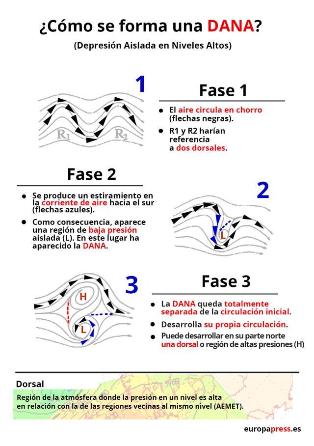 Una DANA, o gota fría, nace de las corrientes en chorro, que son masas de aire frío, fuertes y estrechas situadas entre la troposfera y la estratosfera (entre 10 y 50 km de altitud) que pueden llegar a discurrir a lo largo de miles de kilómetros y tener una anchura de varios cientos de kilómetros. Su movimiento habitual es oeste-este pero a veces un extremo de la corriente puede tomar una dirección norte-sur haciendo que la masa de aire se doble e incluso pueda llegar a romperse. Cuando esto ocurre, se crea una masa de aire independiente que sigue siendo fría pero que pasa estar completamente aislada y rodeada de aire templado. Es así como nace una DANA.
