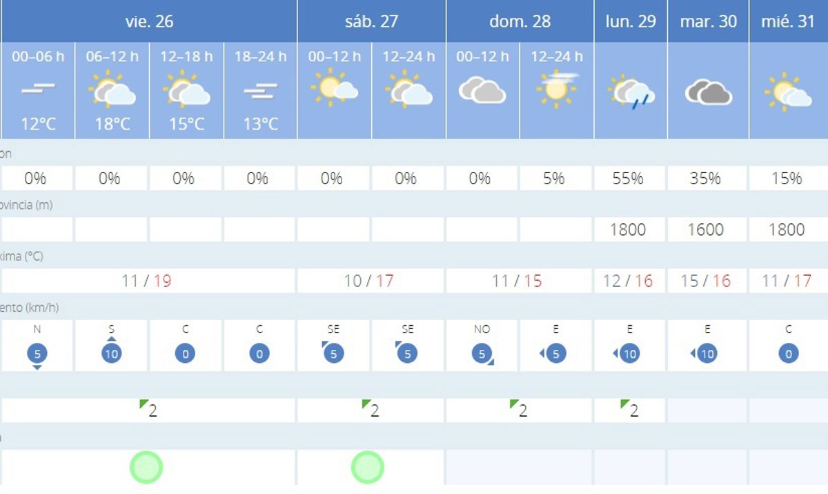 Se esperan vientos del sureste en la mañana con una velocidad de 5 km/h, cambiando a vientos del oeste con una velocidad de 10 km/h durante la tarde y noche. Las temperaturas oscilarán entre una mínima de 10C y una máxima de 20C, y las sensaciones térmicas serán similares. La humedad relativa variará entre 55% y 85%.