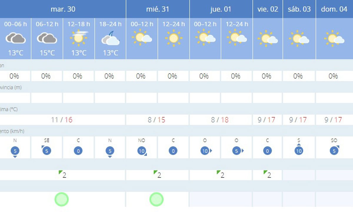 Las temperaturas máximas se situarán en torno a los 15C a 18C, mientras que las mínimas serán de 8C a 9C. La sensación térmica se alineará estrechamente con la temperatura real, y la humedad relativa oscilará entre el 50% y el 85%, dependiendo del día. En general, se espera un tiempo relativamente estable y sin grandes cambios en las condiciones meteorológicas.