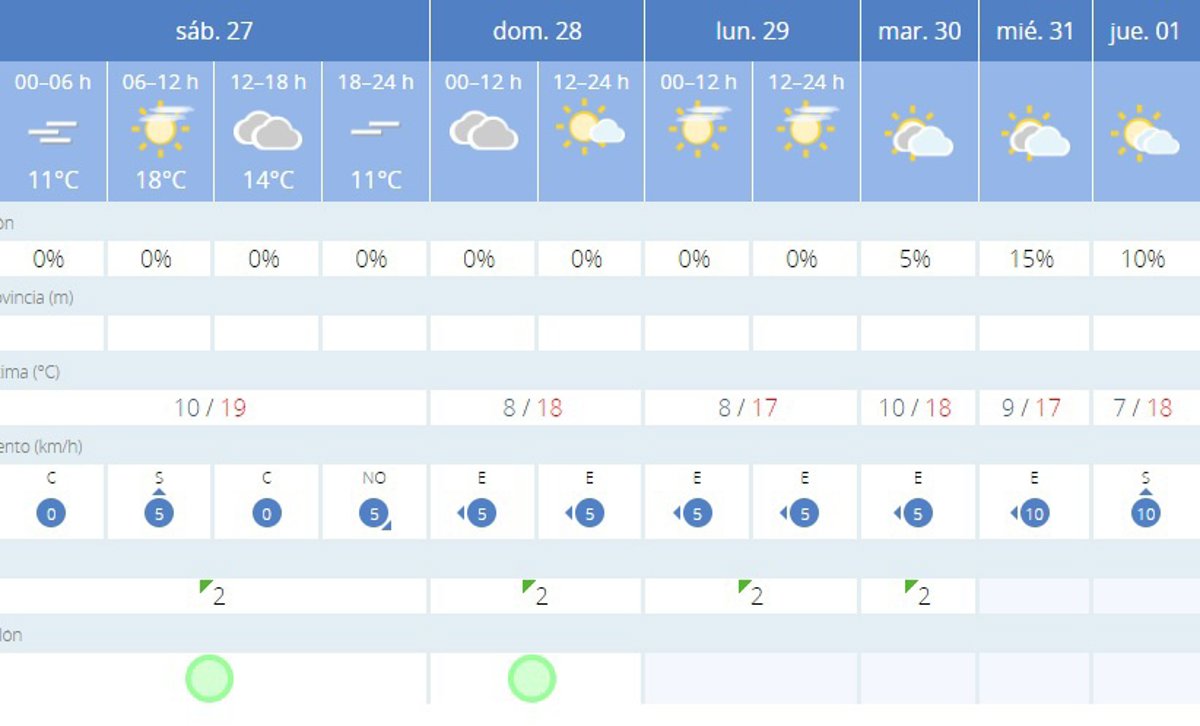 Para los días siguientes hasta el 1 de febrero, se prevé un patrón meteorológico similar, con cielos que alternarán entre parcialmente nubosos y despejados y muy pocas probabilidades de precipitación. Las temperaturas se mantendrán estables, con mínimas en torno a los 7C-10C y máximas alrededor de los 17C-21C. Los vientos serán generalmente leves y de dirección variable. La humedad relativa fluctuará entre el 55% y el 95%, dependiendo del día y la hora. El índice UV se mantendrá en niveles bajos a moderados.