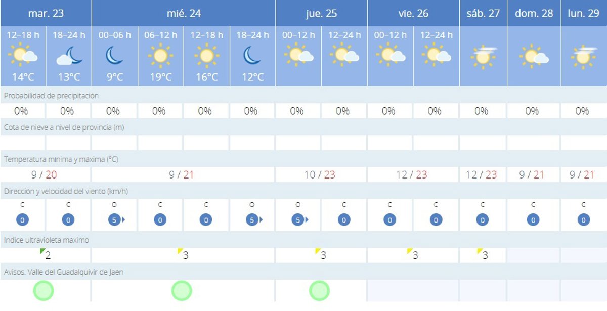 La predicción meteorológica de la Agencia Estatal de Meteorología (AEMET) para Jaén, el 23 de enero de 2024, anuncia un día mayormente despejado. La probabilidad de precipitación se mantiene en un 0% durante todo el día. Las temperaturas fluctuarán entre una mínima de 9C y una máxima de 20C, con una sensación térmica muy similar.