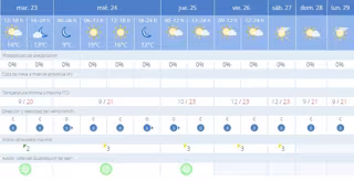 Se espera un cielo poco nuboso a partir del mediodía, manteniéndose así hasta la noche. El viento será calmado, con una dirección predominante del noreste y una velocidad de 5 km/h durante la tarde.