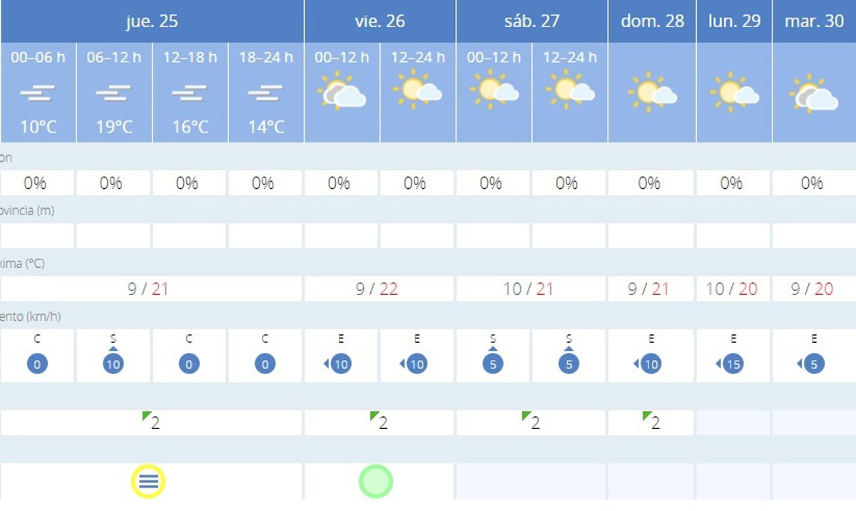 Las temperaturas variarán entre una mínima de 9C y una máxima de 20C, y la sensación térmica se mantendrá en línea con estas temperaturas. La humedad relativa fluctuará entre 55% y 100%, lo que puede resultar en una sensación de humedad especialmente alta en las primeras horas del día y hacia la noche. El índice UV se prevé que alcance un máximo de 2.