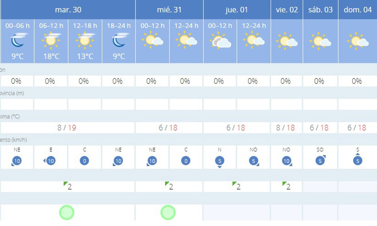 La predicción meteorológica de la Agencia Estatal de Meteorología (AEMET) para Palma a partir del 2024-01-30 señala días predominantemente secos y con cielos mayormente despejados. Para el 2024-01-30, se espera un cielo muy nuboso por la mañana, cambiando a nubes altas hacia la tarde y noche. Los vientos soplarán desde el este a una velocidad de hasta 15 km/h. Las temperaturas oscilarán entre los 8C y los 19C, con una sensación térmica similar. La humedad relativa estará entre el 50% y el 100%.