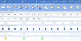 Las temperaturas oscilarán entre 6C y 12C, con vientos predominantemente del suroeste que alcanzarán velocidades de hasta 40 km/h y rachas máximas de 65 km/h. La humedad relativa estará entre el 70% y el 90%.