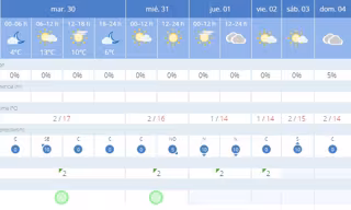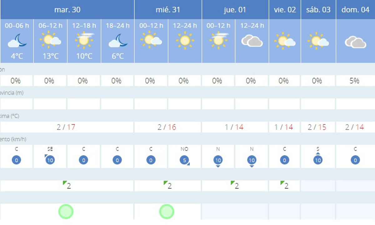 La predicción meteorológica de la Agencia Estatal de Meteorología (AEMET) para Reinosa, a partir del 2024-01-30, indica que el clima será mayormente estable. El día comienza con cielos poco nubosos, evolucionando a nubes altas hacia el final del día. La probabilidad de precipitación es del 0% durante todo el día. Los vientos serán del sureste con una velocidad constante de 10 km/h. Las temperaturas oscilarán entre los 2C de mínima y los 17C de máxima. La sensación térmica seguirá estos valores, con una humedad relativa que fluctuará entre el 45% y el 95%. El índice UV máximo será de 2.