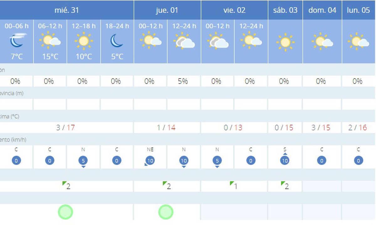 Adentrándonos en el 1 de febrero de 2024, la situación se mantiene similar, con cielos poco nubosos que evolucionarán a despejados a medida que avance el día. Las temperaturas continuarán siendo frescas, oscilando entre los 1C y los 14C.