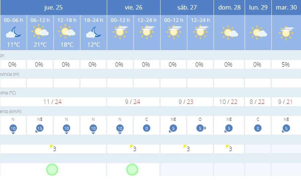 Las temperaturas se mantendrán estables, con máximas en torno a 21C-24C y mínimas alrededor de 9C-11C. Los vientos serán generalmente ligeros, con algunas variaciones en dirección y velocidad. La humedad relativa presentará variaciones notables a lo largo de los días.