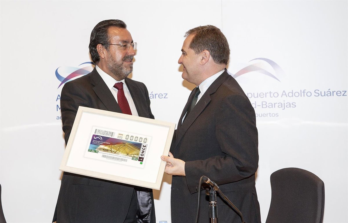 El presidente de la ONCE y su Fundación, Miguel Carballeda, el presidente de Aena, José Manuel Vargas, la directora del aeropuerto, Elena Mayoral, han presentado este cupón durante un acto en el que han estado acompañados por directivos del gestor aeroportuario y de la ONCE, entre otros invitados.