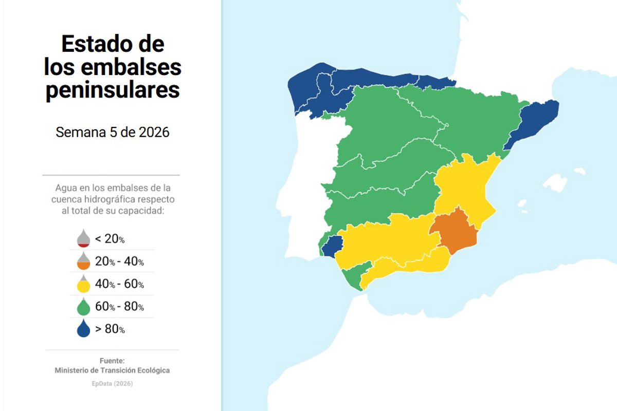 La reserva hídrica almacena 37.706 hectómetros cúbicos (hm3) y está al 67,3% de su capacidad, según datos del Ministerio para la Transición Ecológica y el Reto Demográfico (MITECO) consultados por Europa Press. Durante la última semana los embalses han ganado 4.516 hm3, o lo que es lo mismo, el 8,1% de su capacidad.