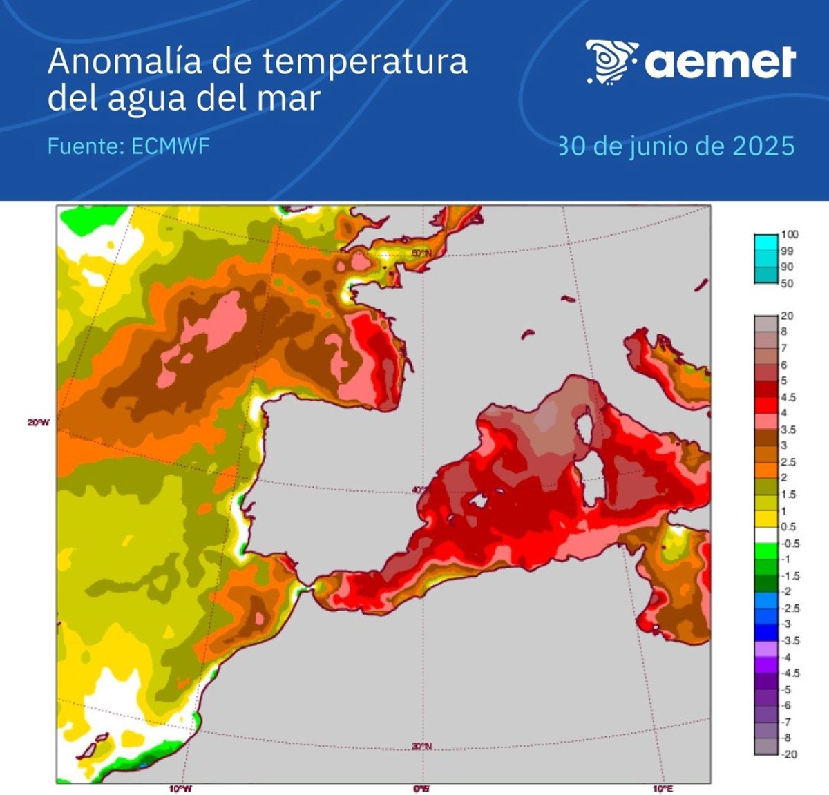 El organismo estatal ha compartido un mapa con su mensaje que muestra las anomalías de temperatura del agua del mar el 30 de junio de 2025 partiendo de los datos del Centro Europeo de Previsiones Meteorológicas a Plazo Medio.