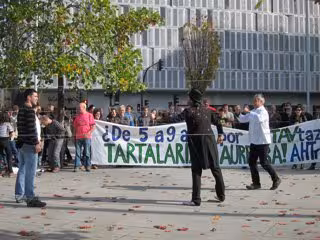 Los asistentes a la concentración de AHT Gelditu se han concentrado tras la pancarta '¿De 5 a 9 años por un TAVtazo? Tartalariak aurrera! AHTrik ez' y han coreado gritos como 'No hay tarta para tanto cara', 'No al tren de alta velocidad', o 'El dinero del TAV para gasto social'.