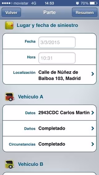 Con este servicio, una persona implicada en un golpe de circulación puede hacer llegar a su aseguradora en el momento del accidente la información necesaria para que se tramite de forma ágil y eficiente el siniestro. Los menús que van apareciendo en la pantalla permiten facilitar los datos de las personas implicadas en la colisión, las características de los vehículos, las zonas que han sufrido desperfectos, así como dar una explicación somera del accidente.