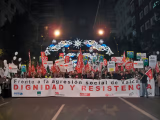 De igual modo, a la pancarta central de la marcha 'Frente a la agresión social de Valcárcel, dignidad y resistencia', encabezada por los secretarios generales en Murcia de UGT y CCOO, Antonio Jiménez y Daniel Bueno, respectivamente, le siguieron otras en las que se leía 'Más esfuerzo mental y menos recorte social', 'Valcárcel, cretino despide a tu sobrino', 'En defensa dignidad del personal del empleo público. Soy funcionario, soy trabajador y ciudadano', o 'Valcárcel no escucha nuestros problemas, no dialoga, impone'.