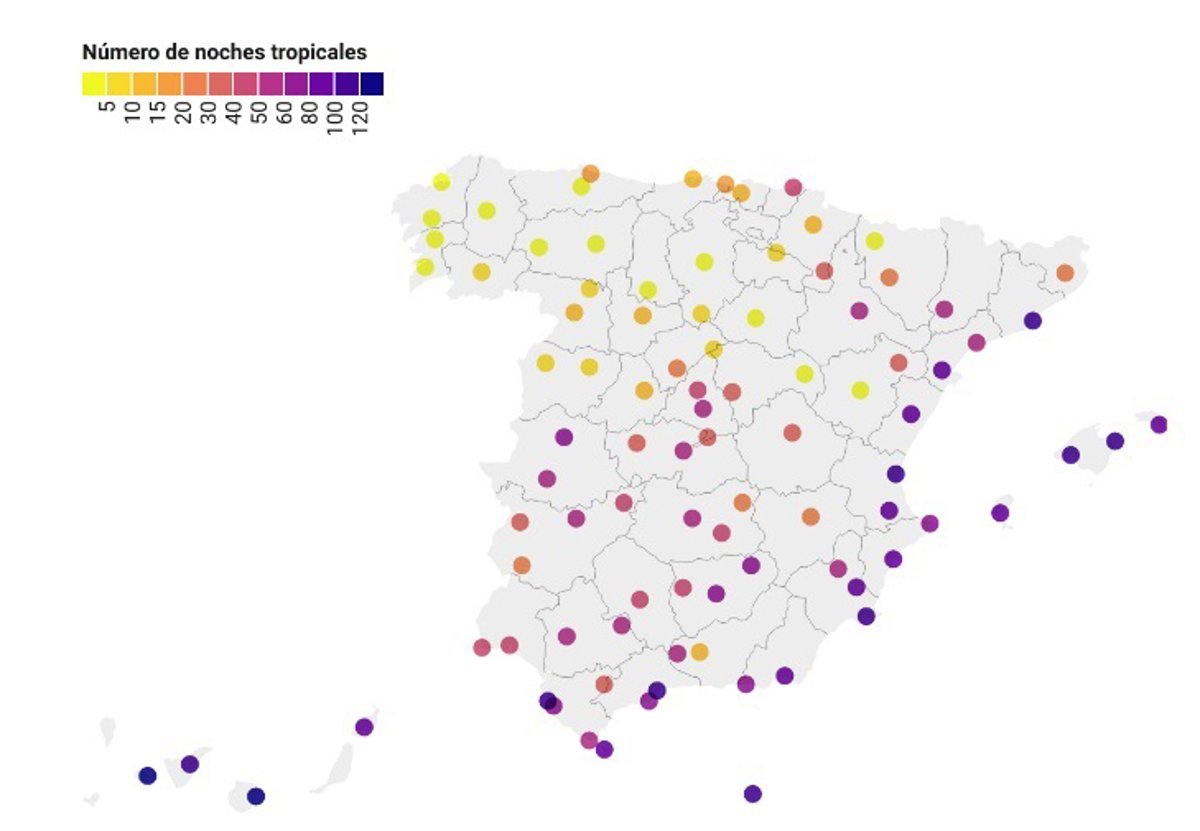 Este año 2022 ha registrado hasta la fecha más de 100 noches tropicales y de 50 ecuatoriales en las zonas de España más castigadas por el calor nocturno, según datos de eltiempo.es. Todo ello se debe al verano tan extremadamente cálido, que ha dejado altas temperaturas por la noche en la mayoría de las estaciones.