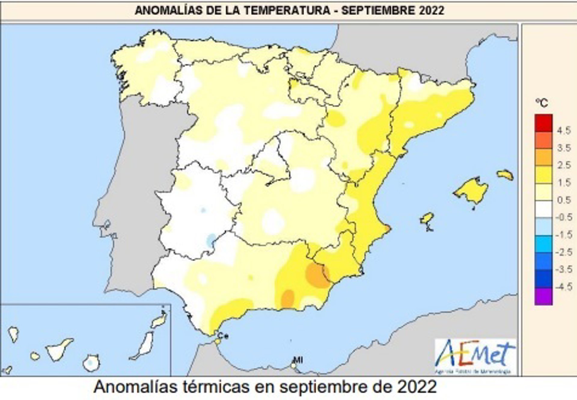 Septiembre fue extremadamente cálido en la costa sureste peninsular, muy cálido en el resto de la costa mediterránea, cálido en el centro y en el cuadrante noroeste peninsular, y normal o frío en Extremadura, sur de Castilla y León y extremo occidental de Andalucía. En Baleares tuvo un carácter muy cálido o extremadamente cálido, mientras que en Canarias presentó un carácter muy variable de unas zonas a otras, resultando en conjunto normal.