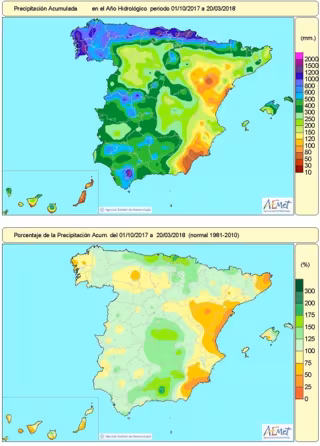 El valor medio de precipitaciones acumuladas desde el 1 de octubre hasta el 20 de marzo de 2018 alcanza 409 litros por metro cuadrado, lo que supone un 6 por ciento más del valor medio normal para este periodo, que son 384 litros por metro cuadrado, según la Agencia Estatal de Meteorología (AEMET).