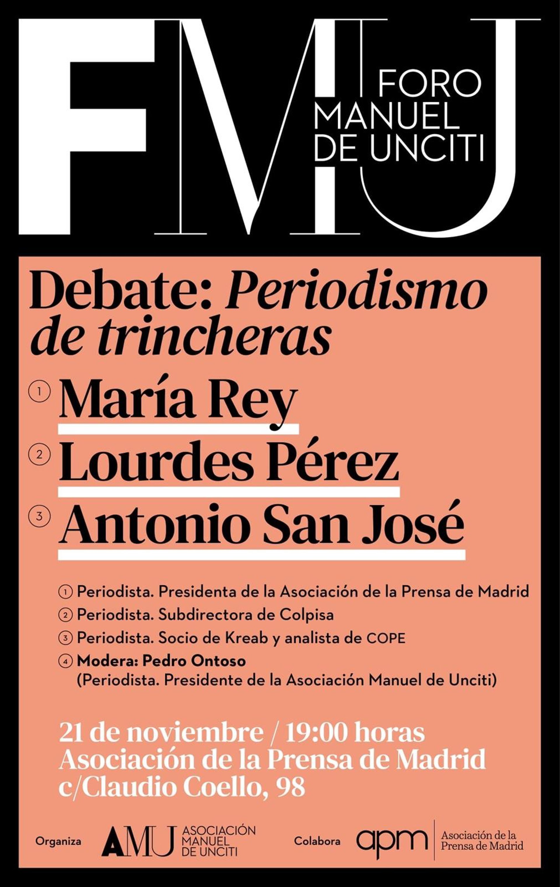 El debate estará moderado por el periodista Pedro Ontoso, exsubdirector de El Correo, de Bilbao, y presidente de la AMU, asociación creada en memoria del sacerdote y periodista Manuel de Unciti, fundador y director de la Residencia Azorín para estudiantes de Periodismo durante 40 años, por la que han pasado más de 300 profesionales que ejercen el periodismo en distintos medios de comunicación españoles.