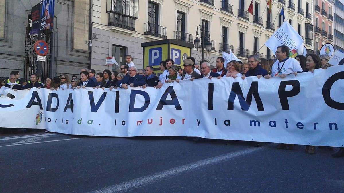 En la cabecera de la manifestación, una gran pancarta de 15 metros de largo precede a los representantes de algunas de las asociaciones convocantes 'provida' que marcan el paso al resto de los asistentes en un ambiente festivo, musical y reivindicativo.