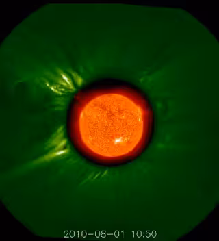 Una de las más rápidas eyecciones de masa coronal solar registradas en los últimos años fue capturada por dos telescopios este pasado 1 de agosto. En el vídeo, que combina imágenes del COR1 con las del STEREO UVI emplazado en el Helios II, muestra una súbita explosión de material hacia el exterior, seguida por una erupción lenta de una prominencia en la corona polar en otra parte del Sol. Esta eyección partío en dirección a la Tierra a una velocidad de 1.000 kilómetros por segundo.