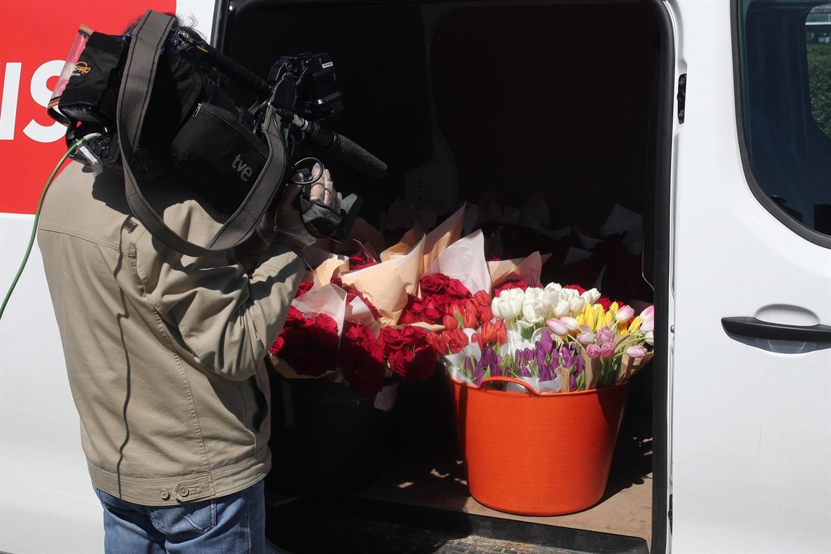 Un periodista graba el interior de una furgoneta repleta de flores que la Fundación Madrina envía para regalar a los sanitarios y para decorar el hospital de campaña en IFEMA, donde se atiende a contagiados por coronavirus derivados de otros centros de - Eduardo Parra - Europa Press