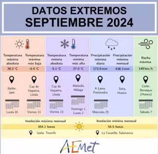 Así, Bailén (Jaén) registró la temperatura máxima absoluta del mes, 38,2ºC, el lunes 16. Por su parte, Cap de Vaquèira (Lleida), registró la máxima más baja del mes con -0,4ºC y la mínima absoluta de septiembre, -5,1ºC, ambas el viernes 13. Asimismo, la mínima absoluta más alta estuvo en Marbella (Málaga), que marcó 27ºC el domingo 1 y el lunes 2.