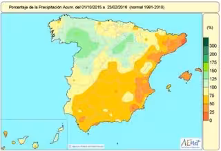 El valor medio nacional de precipitaciones acumuladas desde que comenzó el presente año hidrológico el 1 de octubre hasta el 23 de febrero se sitúa en un 15 por ciento por debajo de lo normal, con 291 litros por metro cuadrado, frente a un 343 litros por metro cuadrado, que sería el valor medio normal según la Agencia Estatal de Meteorología (AEMET).