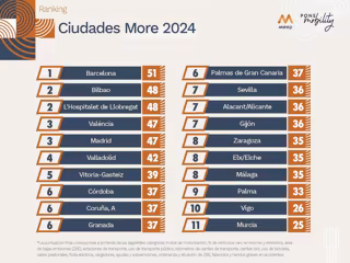 El ranking lo completan Valladolid, en quinta posición con 42 puntos, seguido de Vitoria-Gasteiz con 39, y empatados a 37 puntos A Coruña, Córdoba, Las Palmas de Gran Canaria y Granada. En el lado opuesto, Palma de Mallorca, Vigo y Murcia son las tres ciudades que cierran la clasificación de ciudades 'MORE' y que cuentan con un mayor margen de mejora en lo relativo a políticas de movilidad sostenible y segura.