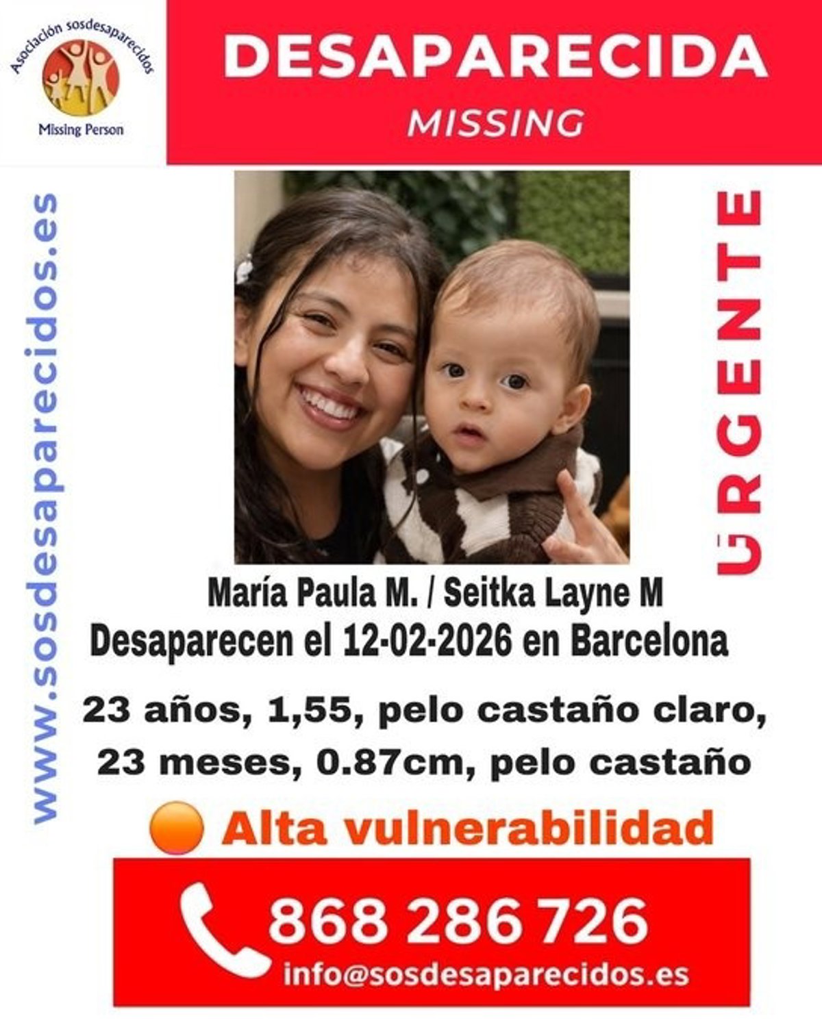 La asociación SOS Desaparecidos busca a María Paula M., de 23 años, y su bebé Seitka Layne M., de 23 meses, quienes se encuentran en paradero desconocido desde el pasado 12 de febrero en Barcelona.