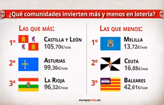 Por el contrario, los que menos Lotería de Navidad tienen consignada son Melilla y Ceuta con 1,18 millones de euros y 1,43 millón de euros, respectivamente, La Rioja (30,4 millones de euros), Navarra (38,6 millones de euros), Baleares (48,1 millones de euros), Cantabria (49,8 millones de euros), Extremadura (60,6 millones de euros), Murcia (96,8 millones de euros), Canarias (98,8 millones de euros) y Asturias (102,1 millones de euros).