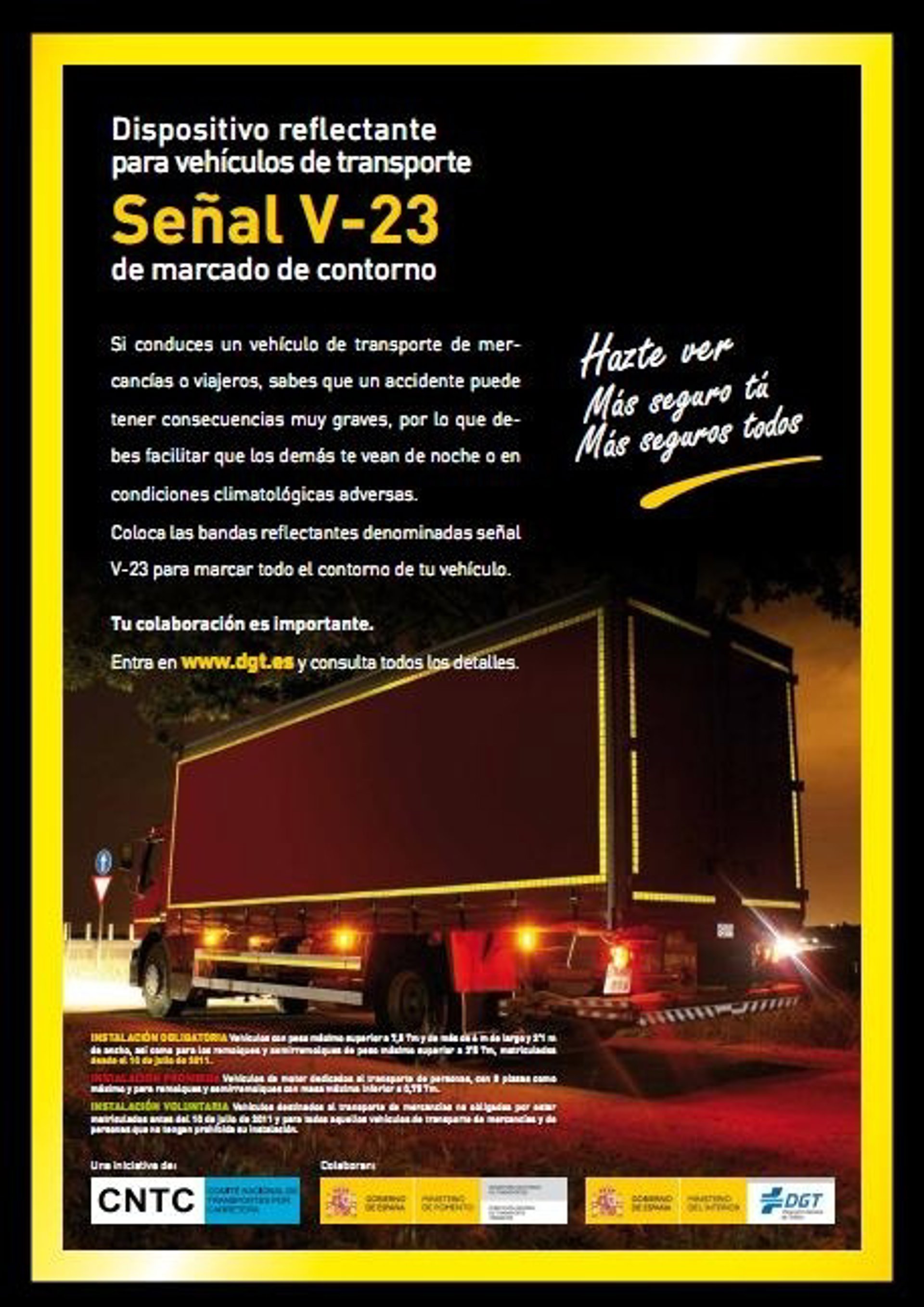 Los camiones más largos y pesados que se matriculen en España a partir de mañana deberán llevar una nueva señal reflectante que recorra el contorno del vehículo, denominada V-23, para que el resto de vehículos que circulen por la carretera de noche puedan hacerse una idea de sus dimensiones. Para los vehículos de transporte pesado, matriculados con anterioridad, la instalación del distintivo será voluntaria.