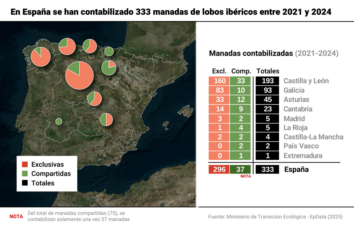 Así, se ha concretado que Castilla y León es la comunidad autónoma que tiene más manadas con un total de 193 (160 exclusivas y 33 compartidas); Galicia le sigue con 93 (83 exclusivas y diez compartidas); Asturias queda en tercer lugar con 45 (33 exclusivas y doce compartidas); y Cantabria va después con 23 (14 exclusivas y nueve compartidas).